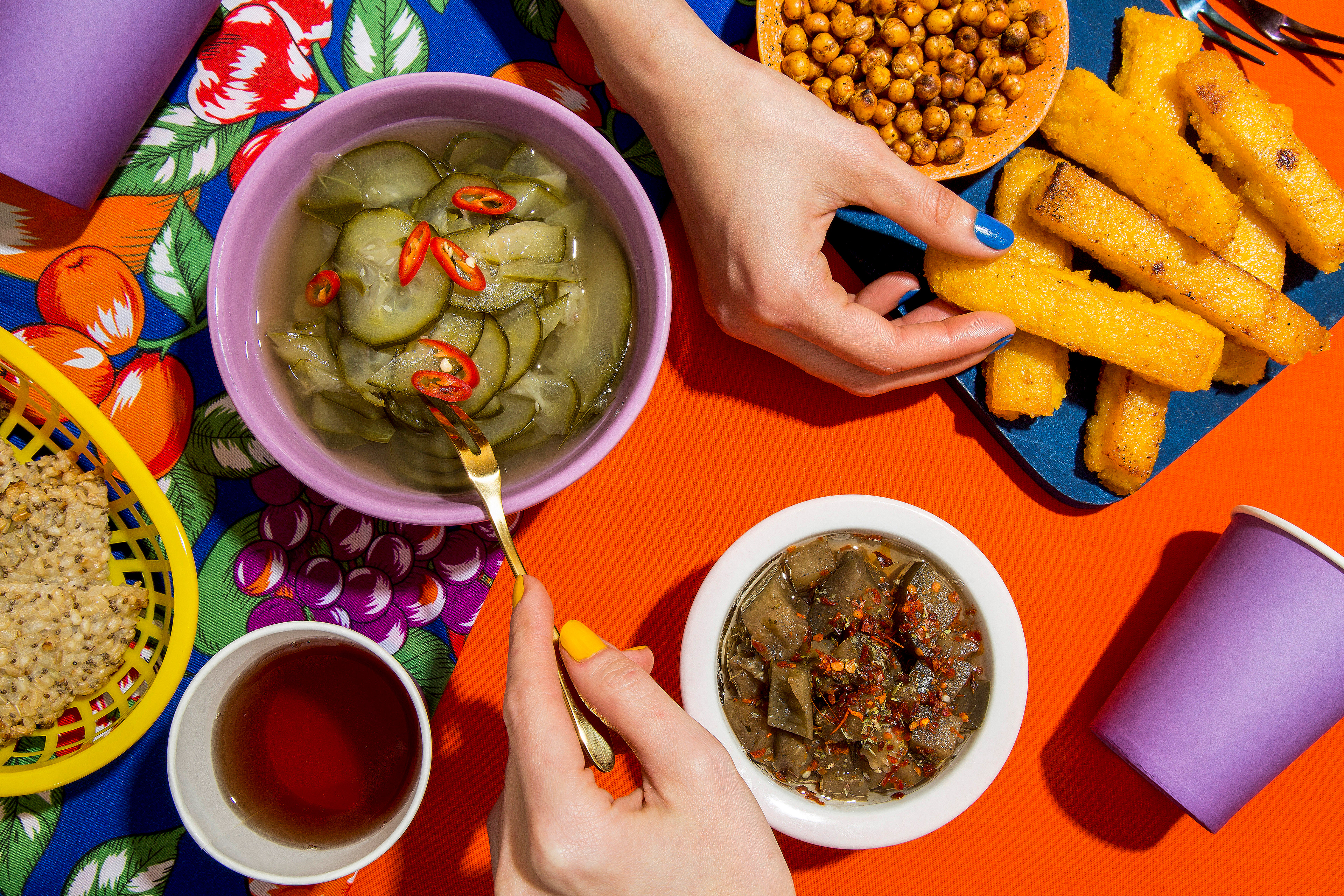 We wanted to create a special aesthetic for Paz and her book, different from the cliché light green graphics and neat food photography on white marble often related to veganism and cook-books. We used a distorted and sometimes back-slanted display sans serif, representing the idea of 'going against mainstream social mandates' paired with a warm serif type and a very pop and wide color palette to convey her loose and upbeat personality. The challenge with the art direction and food photography was to capture this same feel and at the same time make the plates look edible and appetizing.