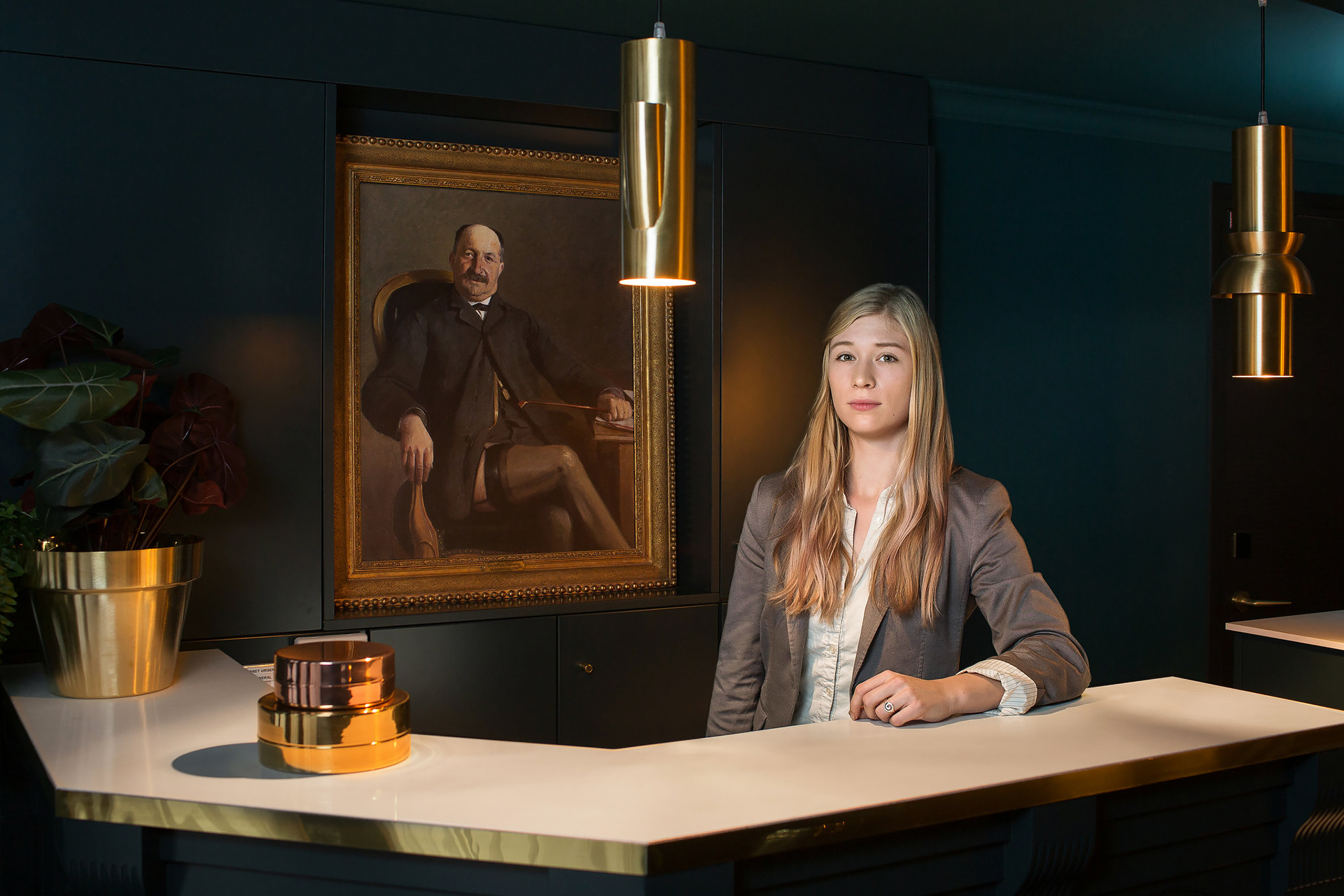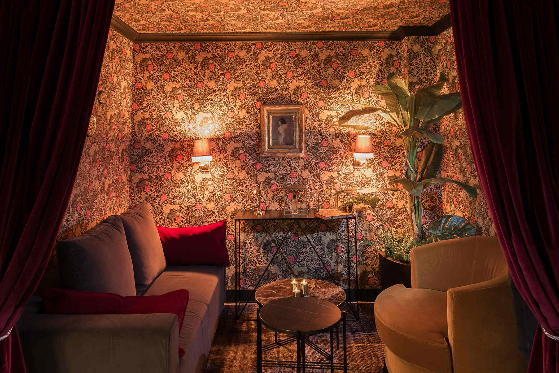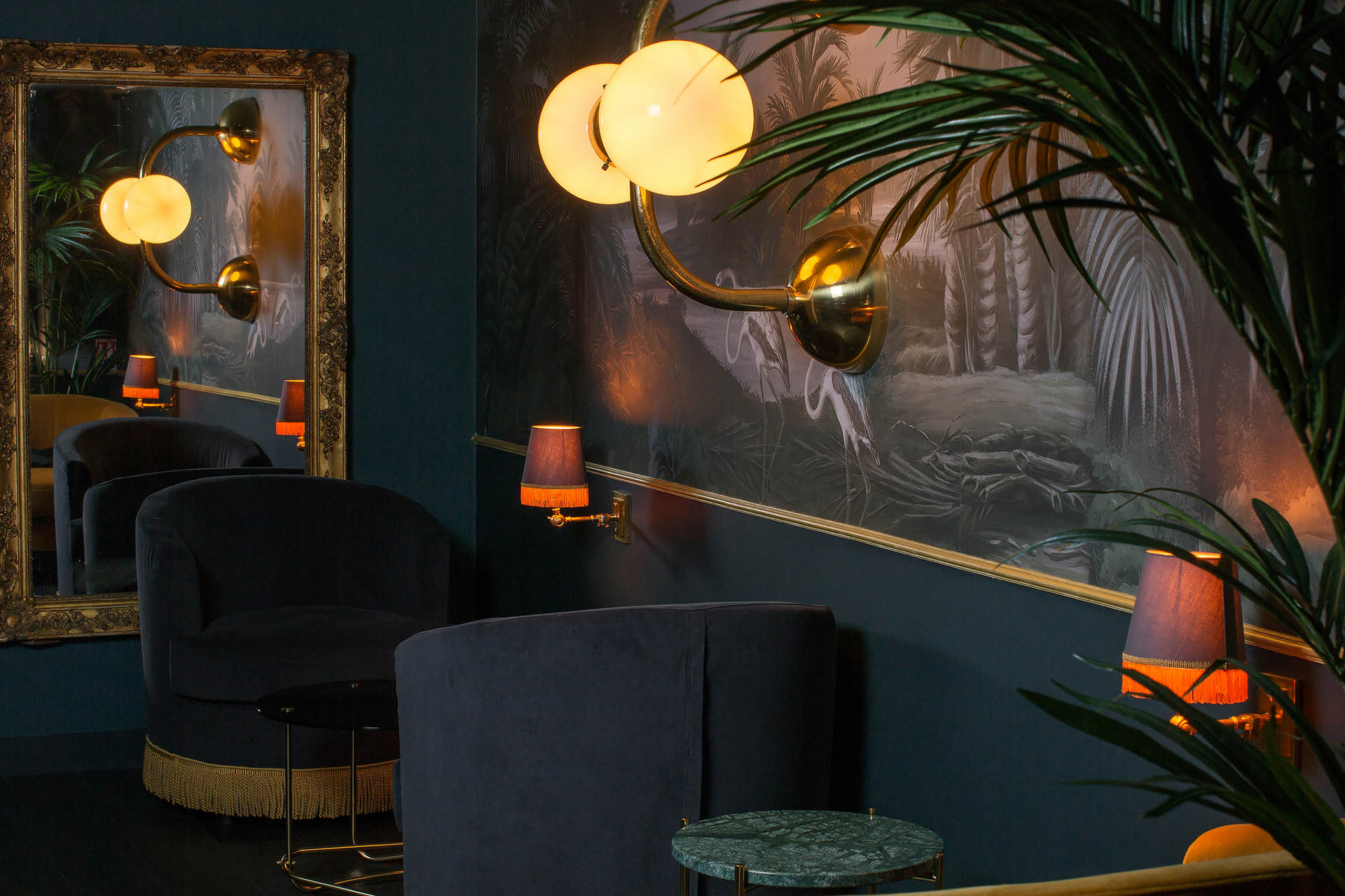 The theme of greenery is very present in the hotel, symbolizing the Parisienne's desire for a touch of authenticity, which she so often lacks. She thus flees towards a universal value: nature, as is perfectly illustrated by the ground floor's panoramic wallpaper. Enormous brass lamps which you can picture adorning the front of a summer holiday home, a reception desk which evokes an antique family heirloom, all within a warm, mellow atmosphere, enriched with lush frondescence.